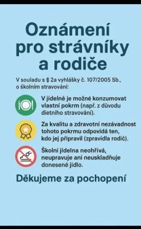 Školní jídelna zahajuje provoz pro žáky základní školy od 2. 9. 2025. Pokud máte o stravování zájem, musí být žák k odběru obědů přihlášen (i v případě, že chodil v loňském školním roce). Pouze u nových strávníků je třeba vyplnit i papírovou přihlášku – ke stažení DOC, ke stažení PDF.
